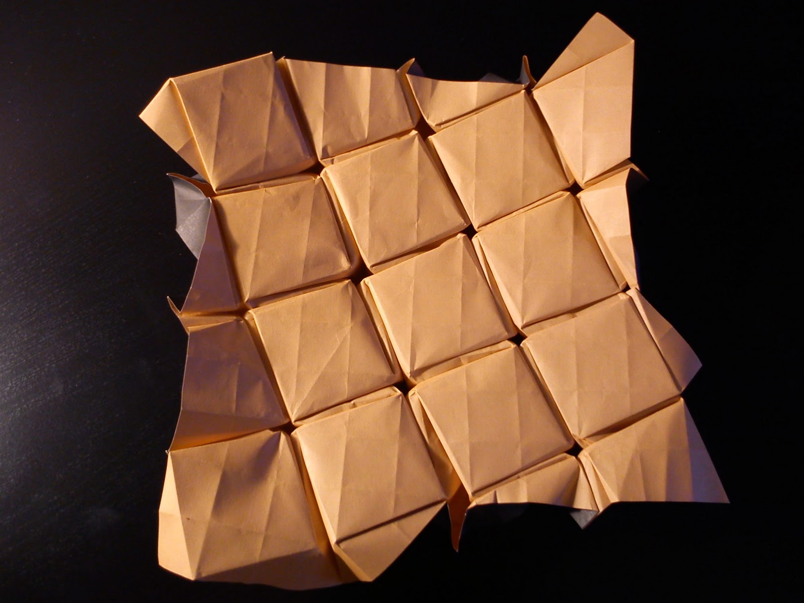 Here it is!. My favorite origami tessellation so far. It's name (as you se in the big text) is Open-back hexagon twist. In the book, by Eric Gjerde, it is a Intermediate project. It is made of a 32-triangle grid on a hexagon.